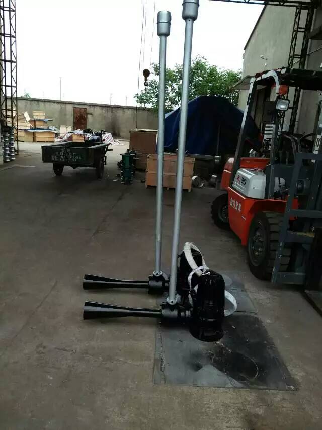 (5)潜水曝气机电机设备均配有支承架和起吊架,其水下部分采用不锈钢方管和圆管(壁厚5mm)制成,水上部分采用不锈钢材料, 潜水射流曝气机主机固定在导架上 快盈安卓版,导架有3只辊轮与方立柱的联接,并通过不锈钢钢丝绳与起吊架上的手动升降器来实现设备的升降,曝气机正常工作时,导架应稳固地落在托架上。