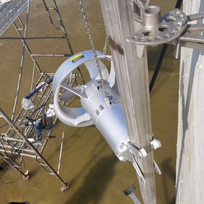 6、潜水搅拌机安装后检验:用手转动皮带轮,潜水搅拌机轴无阻滞现象,叶轮与搅拌器机壳应无碰击声响。